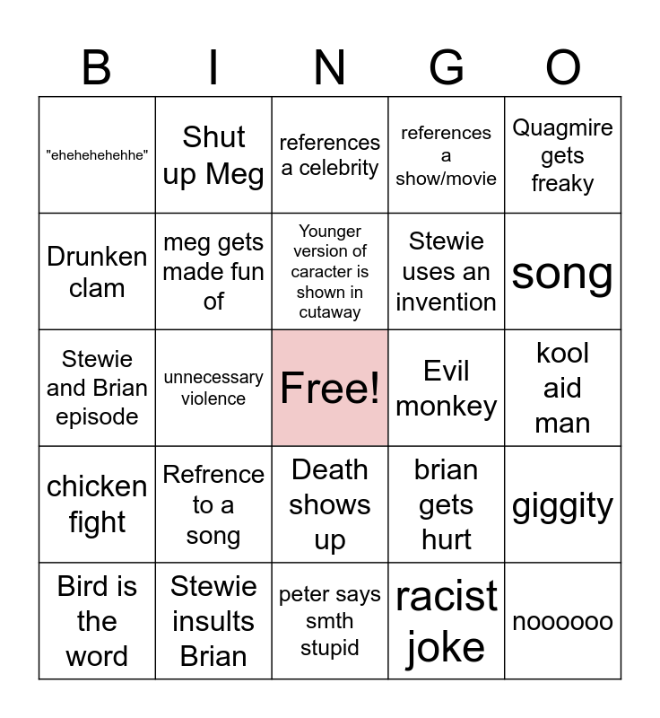This bingo card has a free space and 24 words: Refrence to a song, Stewie insults Brian, Younger version of caracter is shown in cutaway, Bird is the word, Quagmire gets freaky, "ehehehehehhe", Drunken clam, Shut up Meg, Evil monkey, Death shows up, Stewie uses an invention, Stewie and Brian episode, brian gets hurt, giggity, meg gets made fun of, racist joke, kool aid man, references a celebrity, song, unnecessary violence, noooooo, chicken fight, references a show/movie and peter says smth stupid.