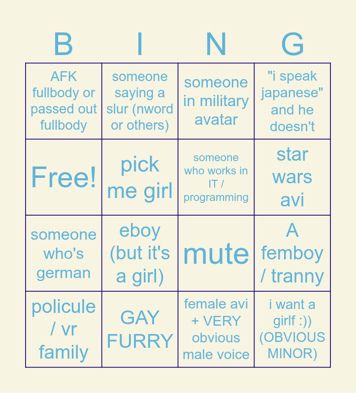 This bingo card has 16 words: GAY FURRY, A femboy / tranny, someone in military avatar, AFK fullbody or passed out fullbody, someone who's german, someone saying a slur (nword or others), mute, female avi + VERY obvious male voice, Free!, pick me girl, policule / vr family, "i speak japanese" and he doesn't, eboy (but it's a girl), star wars avi, someone who works in IT / programming and i want a girlf :))(OBVIOUS MINOR).