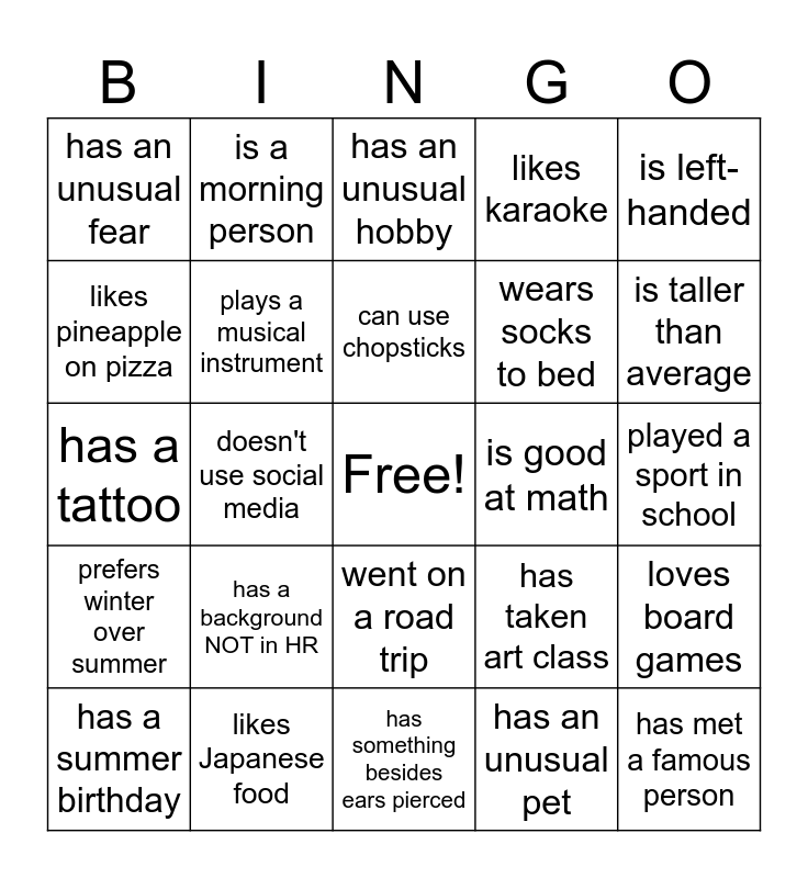 This bingo card has a free space and 34 words: is a vegetarian, has an unusual pet, has been out of the country, has more than 1 child, prefers winter over summer, plays a musical instrument, is left-handed, has a summer birthday, is a morning person, can do a cartwheel, can use chopsticks, has an unusual hobby, is bilingual, is an only child, is good at math, is taller than average, likes Japanese food, has a tattoo, has a background NOT in HR, has taken art class, went on a road trip, doesn't have a driver's license, has an unusual fear, played a sport in school, has something besides ears pierced, has met a famous person, likes karaoke, doesn't know how to swim, wears socks to bed, likes pineapple on pizza, prefers iced coffee to hot, doesn't use social media, loves board games and has a secret talent.