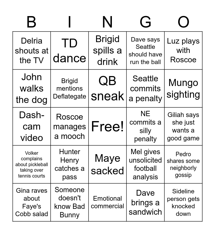 This bingo card has a free space and 91 words: Trick Play, End zone celebration, Maye sacked, Tina mentions Jayden Daniels, Maye throws an interception, Darnold throws an interception, Kicker misses a kick, Kick return for over 20 yards, 40+ yard field goal, Play-action play, Stevenson runs for over 10 yards, Walker TD, Cooper Kupp makes a catch, Giliah says she just wants a good game, Walker runs for a first down, QB sneak, Someone is confused about grounding, Bad Bunny has a costume change, Jeep commercial, Commercial with a talking animal, Clydesdales are back!, Peyton Manning in a commercial, Emotional commercial, Elmo sighting, Dash-cam video, Someone doesn't know Bad Bunny, Safety, The camera shows a celebrity in the crowd, Tom Brady sighting, Golden Gate bridge shot, Nate checks his phone, Pedro shares some neighborly gossip, Sharon shows her trick of standing without arms, Volker complains about pickleball taking over tennis courts, Delria shouts at the TV, Dave says Seattle should have run the ball, Brigid spills a drink, Faye lets out a hearty laugh, Roscoe manages a mooch, Mungo sighting, Gina raves about Faye's Cobb salad, John walks the dog, Luz dances during halftime, ShaVon takes a photo, Mel explains difference between "injured" and "hurt", Mel gives unsolicited football analysis, Emmanuel references Tom Brady, Emmanuel positions his lucky chair, Seattle scores, Darnold completes a 20+ yard pass, Seattle challenges a play, Seattle commits a penalty, Camera shows a Seattle fan going wild, NE scores a TD, NE fumbles, NE misses a kick, NE commits a silly penalty, NE coach looks animated, Camera shows a NE fan looking stressed, NE gets a big third-down stop, 50+ yard field goal, John doesn't know who Charlie Puth is, Matt Damon sighting, Olympic rings are shown, Fumble!, Gatorade is poured on coach, ShaVon has a fireball shot, Dave brings a sandwich, Nate asks people to be quiet during the commercial, Henderson gets a first down, Hunter Henry catches a pass, Sideline person gets knocked down, Diggs catches a pass, Turbo Tax commercial, TD dance, Brigid mentions Deflategate, Someone doesn't use a coaster, Referee Huddle, Red challenge flag, Volker goes back for seconds, Sharon asks what just happened, Luz plays with Roscoe, Faye is eager for more pickleball, Bradley Cooper talks about food, John calls "holding", Someone brings up cost of commercials, Beast Mode skydives, Derrick Henry throws a pass, Player tears up during national anthem, Wide receiver drops the ball and Close up of coach yelling.