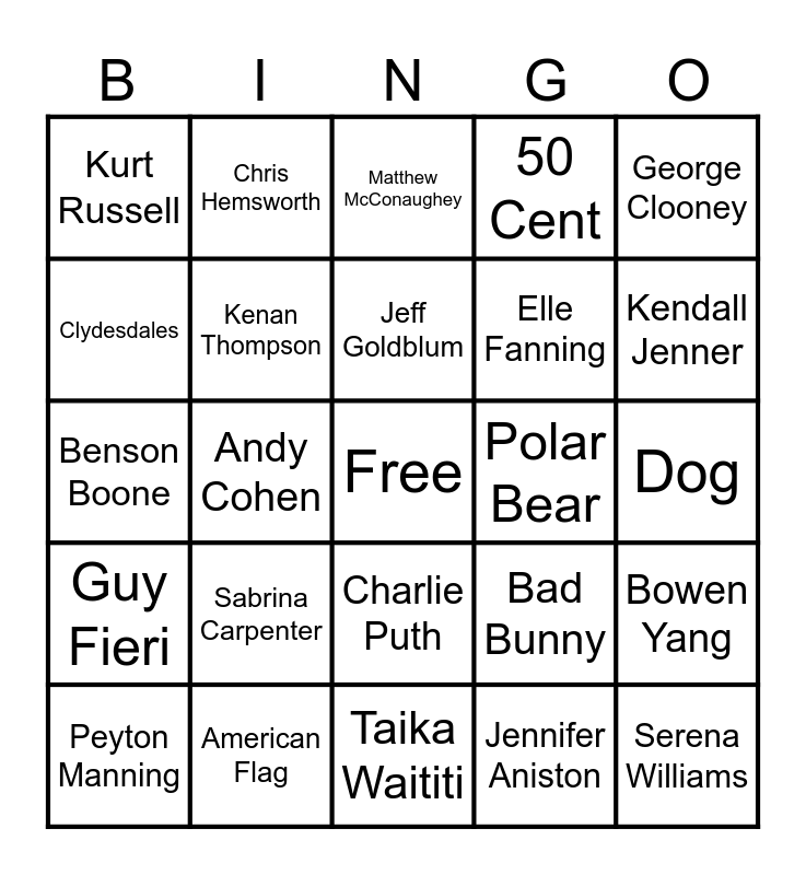This bingo card has a free space and 34 words: Ben Affleck, Jennifer Aniston, Matt LeBlanc, Jason Alexander, Guy Fieri, Kenan Thompson, George Clooney, Peyton Manning, Chris Hemsworth, Jon Hamm, Jeff Goldblum, Matthew McConaughey, Bradley Cooper, Dinosaurs, Polar Bear, Kendall Jenner, American Flag, Benson Boone, Sabrina Carpenter, Bad Bunny, Charlie Puth, Post Malone, Kurt Russell, Dog, Taika Waititi, Serena Williams, 50 Cent, Andy Samberg, Elle Fanning, Clydesdales, Ben Stiller, Andy Cohen, Bowen Yang and Emma Stone.