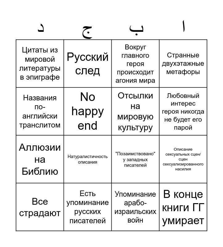 This bingo card has 16 words: Все страдают, Есть упоминание русских писателей, Вокруг главного героя происходит агония мира, Странные двухэтажные метафоры, Названия по-английски транслитом, Русский след, "Позаимствовано" у западных писателей, Описание сексуальных сцен/сцен сексуализированного насилия, Цитаты из мировой литературы в эпиграфе, No happy end, Упоминание арабо-израильских войн, Любовный интерес героя никогда не будет его парой, Аллюзии на Библию, Натуралистичность описания, Отсылки на мировую культуру and В конце книги ГГ умирает.