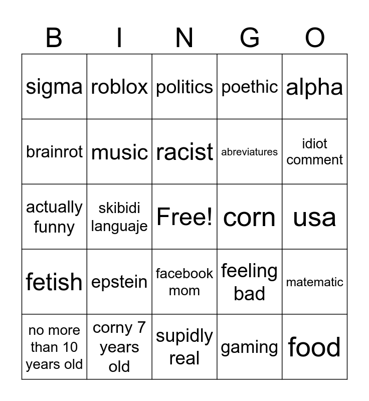 This bingo card has a free space and 24 words: epstein, corny 7 years old, racist, no more than 10 years old, alpha, sigma, brainrot, roblox, corn, facebook mom, abreviatures, actually funny, feeling bad, matematic, music, gaming, usa, politics, idiot comment, skibidi languaje, food, fetish, poethic and supidly real.