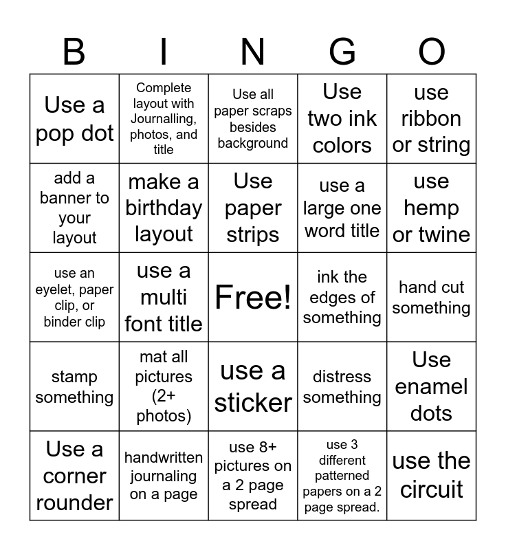 This bingo card has a free space and 29 words: Use a corner rounder, stamp something, use a multi font title, use buttons Or brads, Use a pop dot, Use all paper scraps besides background, make a birthday layout, mat all pictures (2+ photos), ink the edges of something, handwritten journaling on a page, hand cut something, use the circuit, use 8+ pictures on a 2 page spread, use 3 different patterned papers on a 2 page spread., use hemp or twine, add a tag to your layout, use a sticker, stamp something, use ribbon or string, use an eyelet, paper clip, or binder clip, distress something, add a quote, use a large one word title, add a banner to your layout, Use two ink colors, Complete layout with Journalling, photos, and title, Use enamel dots, Use paper strips and Use a border punch.