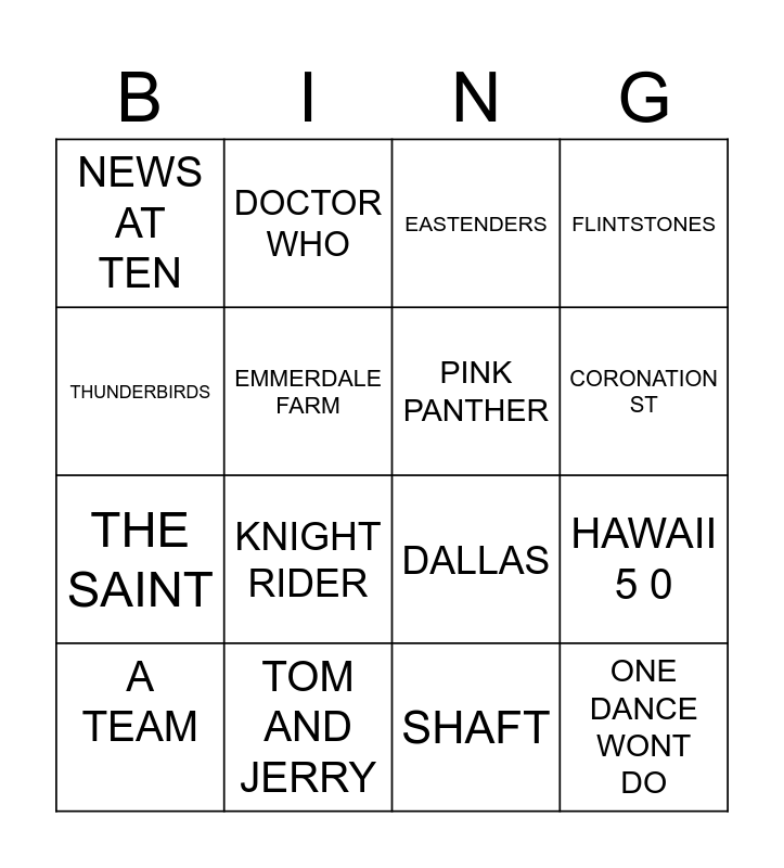 This bingo card has 20 words: A TEAM, HAPPY DAYS, EASTENDERS, HAWAII 5 0, MISSION IMPOSSIBLE, KNIGHT RIDER, SHAFT, FLINTSTONES, THE SAINT, DOCTOR WHO, DALLAS, CORONATION ST, NEWS AT TEN, TOM AND JERRY, PINK PANTHER, ADDAMS FAMILY, THUNDERBIRDS, EMMERDALE FARM, THE MONKEES and ONE DANCE WONT DO.