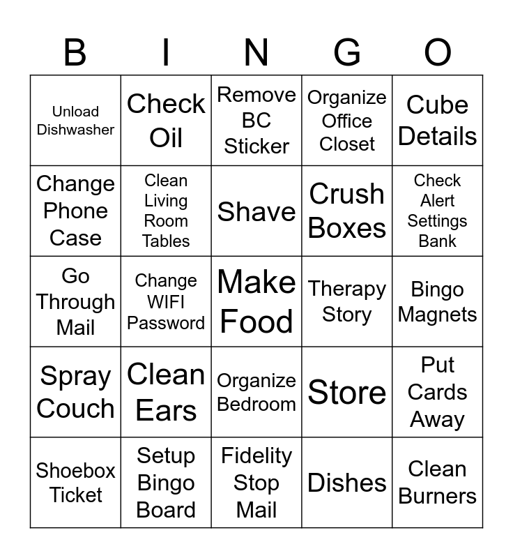 This bingo card has a free space and 24 words: Clean Ears, Setup Bingo Board, Shave, Shoebox Ticket, Cube Details, Unload Dishwasher, Change Phone Case, Check Oil, Therapy Story, Organize Bedroom, Crush Boxes, Go Through Mail, Store, Put Cards Away, Clean Living Room Tables, Dishes, Bingo Magnets, Remove BC Sticker, Check Alert Settings Bank, Change WIFI Password, Clean Burners, Spray Couch, Organize Office Closet and Fidelity Stop Mail.