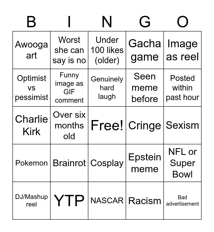 This bingo card has a free space and 24 words: Brainrot, YTP, Genuinely hard laugh, DJ/Mashup reel, Image as reel, Awooga art, Optimist vs pessimist, Worst she can say is no, Cringe, Cosplay, Seen meme before, Charlie Kirk, Epstein meme, NFL or Super Bowl, Funny image as GIF comment, Racism, Sexism, Under 100 likes (older), Posted within past hour, Over six months old, Bad advertisement, Pokemon, Gacha game and NASCAR.