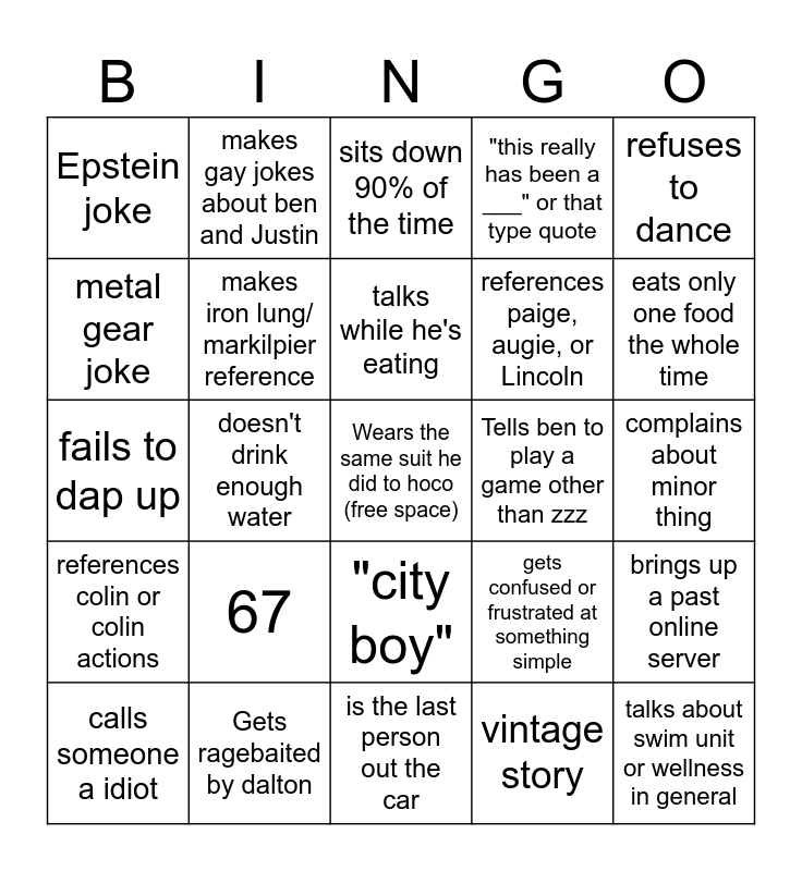 This bingo card has a free space and 24 words: 67, Gets ragebaited by dalton, talks while he's eating, calls someone a idiot, refuses to dance, Epstein joke, metal gear joke, makes gay jokes about ben and Justin, Tells ben to play a game other than zzz, "city boy", references paige, augie, or Lincoln, fails to dap up, gets confused or frustrated at something simple, brings up a past online server, makes iron lung/ markilpier reference, vintage story, complains about minor thing, sits down 90% of the time, eats only one food the whole time, doesn't drink enough water, talks about swim unit or wellness in general, references colin or colin actions, "this really has been a ___" or that type quote and is the last person out the car.