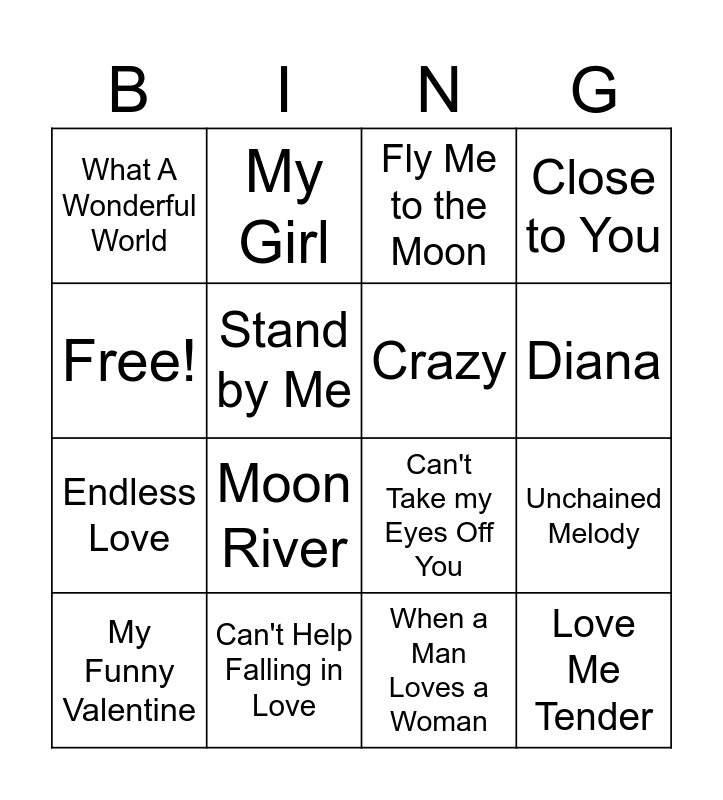 This bingo card has 16 words: Can't Help Falling in Love, Unchained Melody, Fly Me to the Moon, What A Wonderful World, Endless Love, My Girl, Can't Take my Eyes Off You, When a Man Loves a Woman, Free!, Stand by Me, My Funny Valentine, Close to You, Moon River, Diana, Crazy and Love Me Tender.