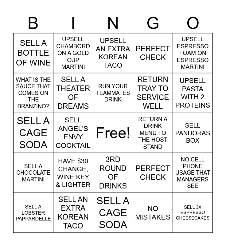 This bingo card has a free space and 24 words: HAVE $30 CHANGE, WINE KEY & LIGHTER, SELL AN EXTRA KOREAN TACO, RUN YOUR TEAMMATES DRINK, SELL A LOBSTER PAPPARDELLE, UPSELL ESPRESSO FOAM ON ESPRESSO MARTINI, SELL A BOTTLE OF WINE, WHAT IS THE SAUCE THAT COMES ON THE BRANZINO?, UPSELL CHAMBORD ON A GOLD CUP MARTINI, RETURN A DRINK MENU TO THE HOST STAND, 3RD ROUND OF DRINKS, RETURN TRAY TO SERVICE WELL, SELL A CAGE SODA, PERFECT CHECK, NO CELL PHONE USAGE THAT MANAGERS SEE, SELL A THEATER OF DREAMS, NO MISTAKES, SELL PANDORAS BOX, UPSELL AN EXTRA KOREAN TACO, UPSELL PASTA WITH 2 PROTEINS, SELL ANGEL'S ENVY COCKTAIL, SELL 3X ESPRESSO CHEESECAKES, SELL A CHOCOLATE MARTINI, PERFECT CHECK and SELL A CAGE SODA.