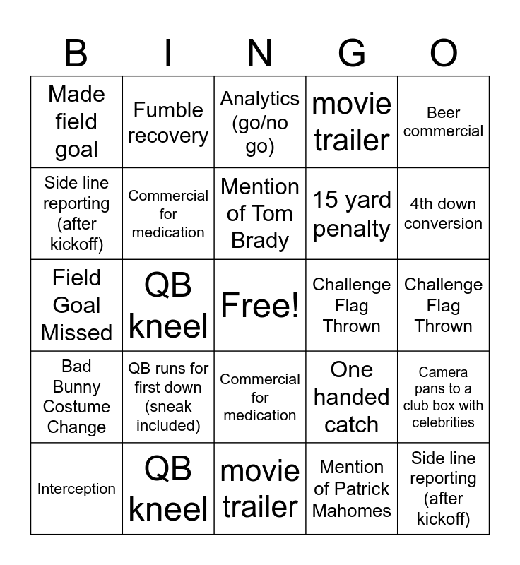 This bingo card has a free space and 63 words: Game tied (not 0-0), White guy scores a touchdown, Completely AI commercial, Camera pans to a club box with celebrities, 4th down conversion, Interception, Fumble recovery, Mention of Patrick Mahomes, Mention of Tom Brady, Commercial for AI company, Commercial for medication, Field Goal Missed, Challenge Flag Thrown, Beer commercial, Player goes into blue medical tent, Side line reporting (after kickoff), QB kneel, Made field goal, One handed catch, 15 yard penalty, QB runs for first down (sneak included), Bad Bunny Costume Change, movie trailer, Cut away to celebrity, Betting lines in broadcast, Announcers booth, Analytics (go/no go), Swearing on a hot mic, Non-qb pass, Choreographed celebration by 2+ players, Game tied (not 0-0), White guy scores a touchdown, AI commercial, Camera pans to a club box with celebrities, 4th down conversion, Interception, Fumble recovery, Mention of Patrick Mahomes, Mention of Tom Brady, Commercial for medication, Field Goal Missed, Challenge Flag Thrown, Beer commercial, Player goes into blue medical tent, Side line reporting (after kickoff), QB kneel, Made field goal, One handed catch, 15 yard penalty, QB runs for first down (sneak included), Bad Bunny Costume Change, movie trailer, Cut away to celebrity, Betting lines in broadcast, Announcers booth, Analytics (go/no go), hot mic (not snap count), Non-qb pass, Choreographed celebration by 2+ players, 4th wall break in commercial, Guest Singer (halftime show), Matthew McConaughey or Ryan Reynolds and Lambeau Leap (player jumps into stands).