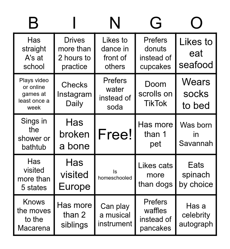 This bingo card has a free space and 24 words: Has visited Europe, Has more than 2 siblings, Prefers water instead of soda, Knows the moves to the Macarena, Likes to eat seafood, Has straight A's at school, Plays video or online games at least once a week, Drives more than 2 hours to practice, Has more than 1 pet, Is homeschooled, Doom scrolls on TikTok, Sings in the shower or bathtub, Likes cats more than dogs, Eats spinach by choice, Checks Instagram Daily, Prefers waffles instead of pancakes, Was born in Savannah, Likes to dance in front of others, Wears socks to bed, Has broken a bone, Has a celebrity autograph, Has visited more than 5 states, Prefers donuts instead of cupcakes and Can play a musical instrument.