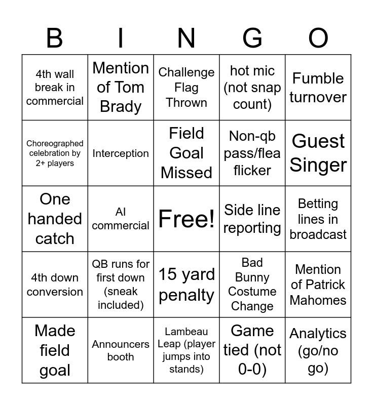This bingo card has a free space and 32 words: Game tied (not 0-0), White guy scores a touchdown, AI commercial, Camera pans to a club box with celebrities, 4th down conversion, Interception, Fumble turnover, Mention of Patrick Mahomes, Mention of Tom Brady, Commercial for medication, Field Goal Missed, Challenge Flag Thrown, Modelo or Corona commercial, Player goes into blue medical tent, Side line reporting, QB kneel, Made field goal, One handed catch, 15 yard penalty, QB runs for first down (sneak included), Bad Bunny Costume Change, movie trailer, Betting lines in broadcast, Announcers booth, Analytics (go/no go), hot mic (not snap count), Non-qb pass/flea flicker, Choreographed celebration by 2+ players, 4th wall break in commercial, Lambeau Leap (player jumps into stands), Matthew McConaughey or Ryan Reynolds and Guest Singer.