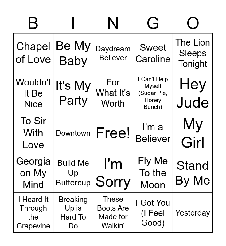 This bingo card has a free space and 24 words: Respect, Yesterday, Happy Together, These Boots Are Made for Walkin', Build Me Up Buttercup, Ain't No Mountain High Enough, Be My Baby, California Dreamin', Wouldn't It Be Nice, Can't Help Falling in Love, It's My Party, Sweet Caroline, Stand By Me, Fly Me To the Moon, Brown Eyed Girl, Sugar Sugar, For What It's Worth, I'm a Believer, Mrs. Robinson, The Lion Sleeps Tonight, Downtown, I Got You (I Feel Good), Chapel of Love and I Can't Help Myself (Sugar Pie, Honey Bunch).