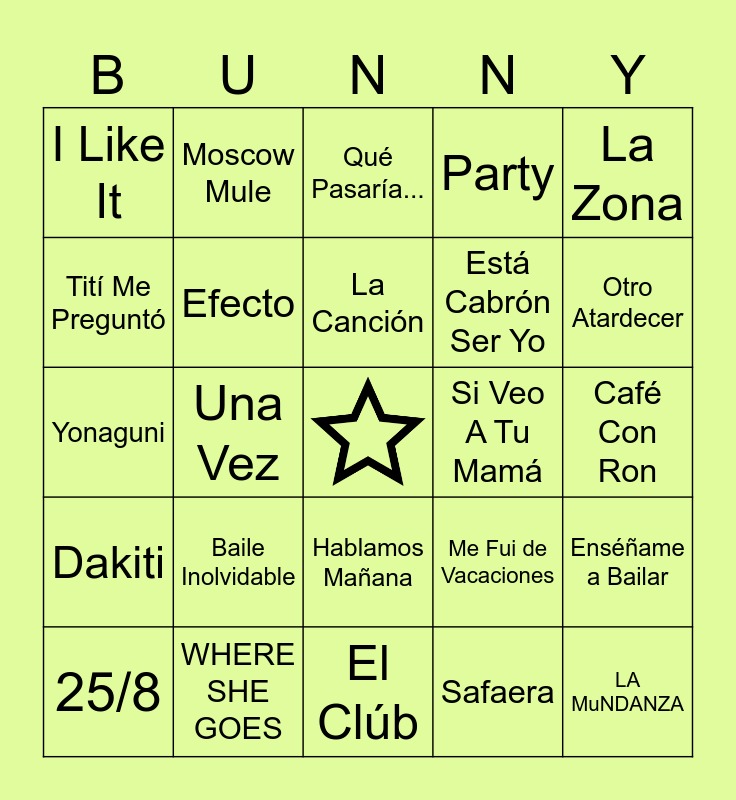 This bingo card has a free space and 49 words: DtMF, LA MuNDANZA, EoO, El Clúb, Baile Inolvidable, El Apagón, Moscow Mule, Me Porto Bonito, Tití Me Preguntó, La Corriente, Efecto, Party, Enséñame a Bailar, Me Fui de Vacaciones, Un Verano Sin Ti, Yo Perreo Sola, La Canción, Si Veo A Tu Mamá, Bichiyal, La Zona, Una Vez, Safaera, I Like It, Está Cabrón Ser Yo, Dos Mil 16, Otro Atardecer, 25/8, P FKN R, Hablamos Mañana, Dakiti, La Droga, LA NOCHE DE ANOCHE, MONACO, BABY NUEVA, WHERE SHE GOES, MIA (feat. Drake sadly), Kloufrens, Perro Negro, Café Con Ron, Pitorro De Coco, Voy A Llevarte Pa PR, Diles (feat. Arcangel & Nengo Flow), Ojitos Lindos, un x100to, Yonaguni, Qué Pasaría..., Neverita, BOKeTE and No Te Hagas.