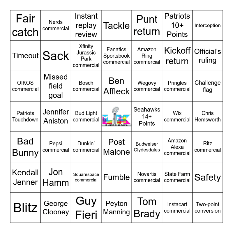 This bingo card has a free space and 62 words: Seahawks Touchdown, Patriots Touchdown, Field goal, Missed field goal, Two-point conversion, Safety, Interception, Pick-six, Sack, Blitz, Tackle, Fumble, Patriots 10+ Points, Seahawks 14+ Points, Punt, Fair catch, Kickoff return, Punt return, Touchback, Timeout, Official’s ruling, Instant replay review, Challenge flag, Bud Light commercial, Budweiser commercial, Budweiser Clydesdales, Pepsi commercial, Pepsi Zero Sugar commercial, Pringles commercial, Ritz commercial, Uber Eats commercial, Squarespace commercial, Instacart commercial, TurboTax commercial, OIKOS commercial, Nerds commercial, Novartis commercial, Amazon Alexa commercial, Amazon Ring commercial, Wix commercial, Fanatics Sportsbook commercial, State Farm commercial, Bosch commercial, Liquid I.V. commercial, Xfinity Jurassic Park commercial, Wegovy commercial, Dunkin’ commercial, George Clooney, Peyton Manning, Tom Brady, Ben Affleck, Jennifer Aniston, Scarlett Johansson, Jon Hamm, Will Ferrell, Chris Hemsworth, Post Malone, Kendall Jenner, Guy Fieri, Morgan Freeman, Bad Bunny and Brandi Carlile.