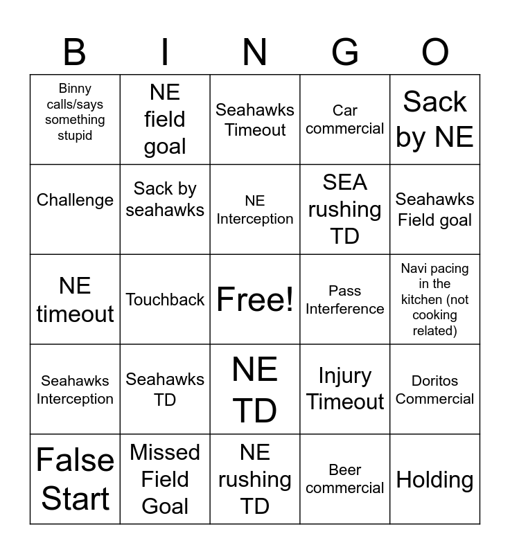 This bingo card has a free space and 24 words: Seahawks TD, Missed Field Goal, NE Interception, False Start, Sack by NE, Binny calls/says something stupid, Challenge, NE field goal, Pass Interference, NE TD, SEA rushing TD, NE timeout, Injury Timeout, Doritos Commercial, Sack by seahawks, Beer commercial, Navi pacing in the kitchen (not cooking related), Seahawks Timeout, Seahawks Field goal, Touchback, Holding, Seahawks Interception, Car commercial and NE rushing TD.
