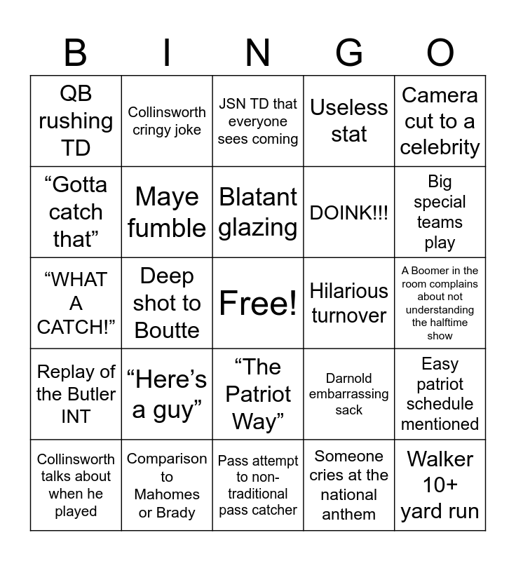 This bingo card has a free space and 24 words: “Here’s a guy”, Comparison to Mahomes or Brady, Blatant glazing, Collinsworth talks about when he played, Camera cut to a celebrity, QB rushing TD, “Gotta catch that”, Collinsworth cringy joke, Hilarious turnover, “The Patriot Way”, DOINK!!!, “WHAT A CATCH!”, Darnold embarrassing sack, Easy patriot schedule mentioned, Maye fumble, Someone cries at the national anthem, A Boomer in the room complains about not understanding the halftime show, JSN TD that everyone sees coming, Big special teams play, Deep shot to Boutte, Walker 10+ yard run, Replay of the Butler INT, Useless stat and Pass attempt to non-traditional pass catcher.