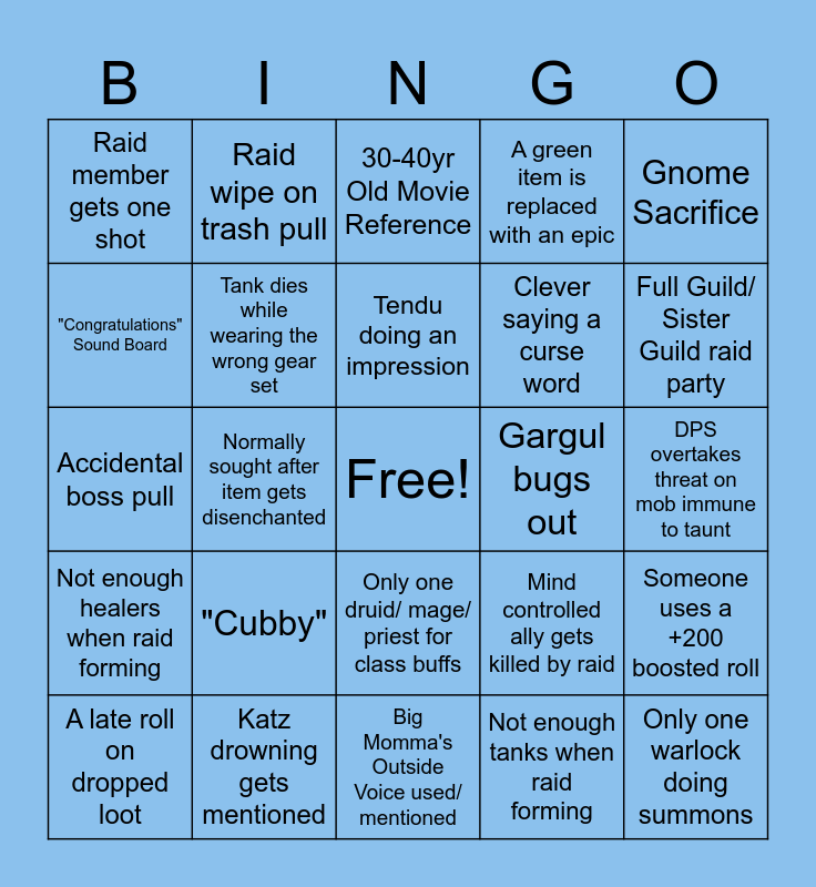This bingo card has a free space and 24 words: "Cubby", Katz drowning gets mentioned, Tendu doing an impression, A late roll on dropped loot, Gnome Sacrifice, Raid member gets one shot, "Congratulations" Sound Board, Raid wipe on trash pull, Gargul bugs out, Only one druid/ mage/ priest for class buffs, Clever saying a curse word, Accidental boss pull, Mind controlled ally gets killed by raid, Someone uses a +200 boosted roll, Tank dies while wearing the wrong gear set, Not enough tanks when raid forming, DPS overtakes threat on mob immune to taunt, 30-40yr Old Movie Reference, Full Guild/ Sister Guild raid party, Normally sought after item gets disenchanted, Only one warlock doing summons, Not enough healers when raid forming, A green item is replaced with an epic and Big Momma's Outside Voice used/ mentioned.