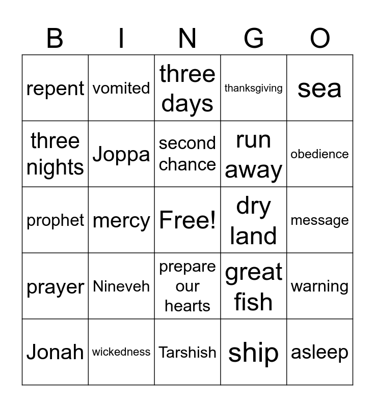 This bingo card has a free space and 29 words: Jonah, mariners, mercy, God, repent, three days, Joppa, Nineveh, dry land, wickedness, message, asleep, Tarshish, ship, obedience, swallowed, prepare our hearts, prayer, sea, prophet, great fish, fasting, run away, three nights, thanksgiving, vomited, warning, second chance and forgiveness.
