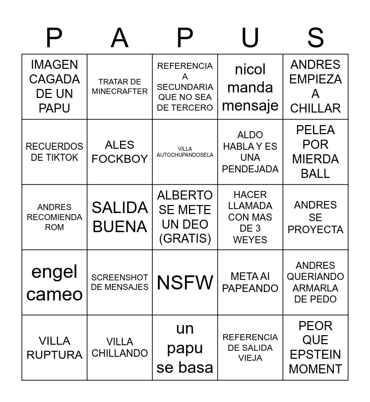 This bingo card has a free space and 24 words: SCREENSHOT DE MENSAJES, VILLA CHILLANDO, VILLA AUTOCHUPANDOSELA, VILLA RUPTURA, ANDRES EMPIEZA A CHILLAR, IMAGEN CAGADA DE UN PAPU, RECUERDOS DE TIKTOK, TRATAR DE MINECRAFTER, HACER LLAMADA CON MAS DE 3 WEYES, NSFW, ALDO HABLA Y ES UNA PENDEJADA, ANDRES RECOMIENDA ROM, META AI PAPEANDO, ANDRES QUERIANDO ARMARLA DE PEDO, ALES FOCKBOY, REFERENCIA DE SALIDA VIEJA, ANDRES SE PROYECTA, REFERENCIA A SECUNDARIA QUE NO SEA DE TERCERO, PELEA POR MIERDA BALL, SALIDA BUENA, PEOR QUE EPSTEIN MOMENT, engel cameo, nicol manda mensaje and un papu se basa.