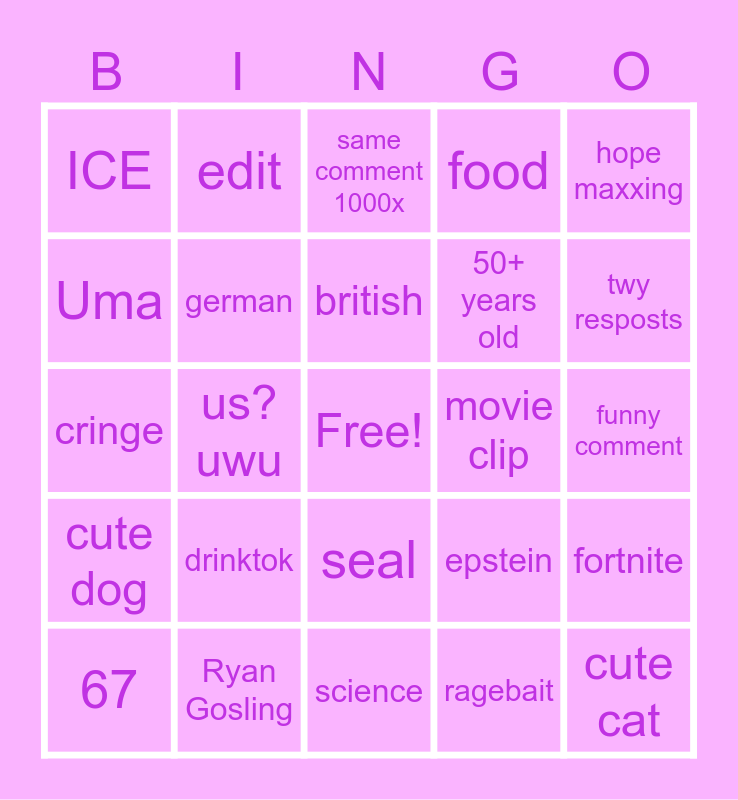 This bingo card has a free space and 24 words: drinktok, Ryan Gosling, british, 67, hope maxxing, ICE, Uma, edit, movie clip, seal, 50+ years old, cringe, epstein, fortnite, german, ragebait, funny comment, same comment 1000x, twy resposts, us? uwu, cute cat, cute dog, food and science.