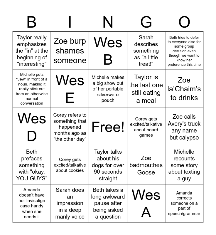 This bingo card has a free space and 24 words: Corey gets excited/talkative about cookies, Sarah does an impression in a deep manly voice, Michelle makes a big show out of her portable silverware pouch, Amanda doesn't have her Invisalign case handy when she needs it, Beth tries to defer to everyone else for some group decision even though we want to know her preference this time, Taylor really emphasizes the "in" at the beginning of "interesting", Michelle puts "Jew" in front of a noun, making it really stick out from an otherwise normal conversation, Zoe burp shames someone, Corey gets excited/talkative about board games, Taylor talks about his dogs for over 90 seconds straight, Taylor is the last one still eating a meal, Wes D, Zoe badmouthes Goose, Michelle recounts some story about texting a guy, Wes E, Wes A, Zoe calls Avery's truck any name but calypso, Wes B, Zoe la’Chaim’s to drinks, Corey refers to something that happened months ago as "the other day", Amanda corrects someone on a part of speech/grammar, Beth prefaces something with "okay, YOU GUYS", Sarah describes something as "a little treat!" and Beth takes a long awkward pause after being asked a question.
