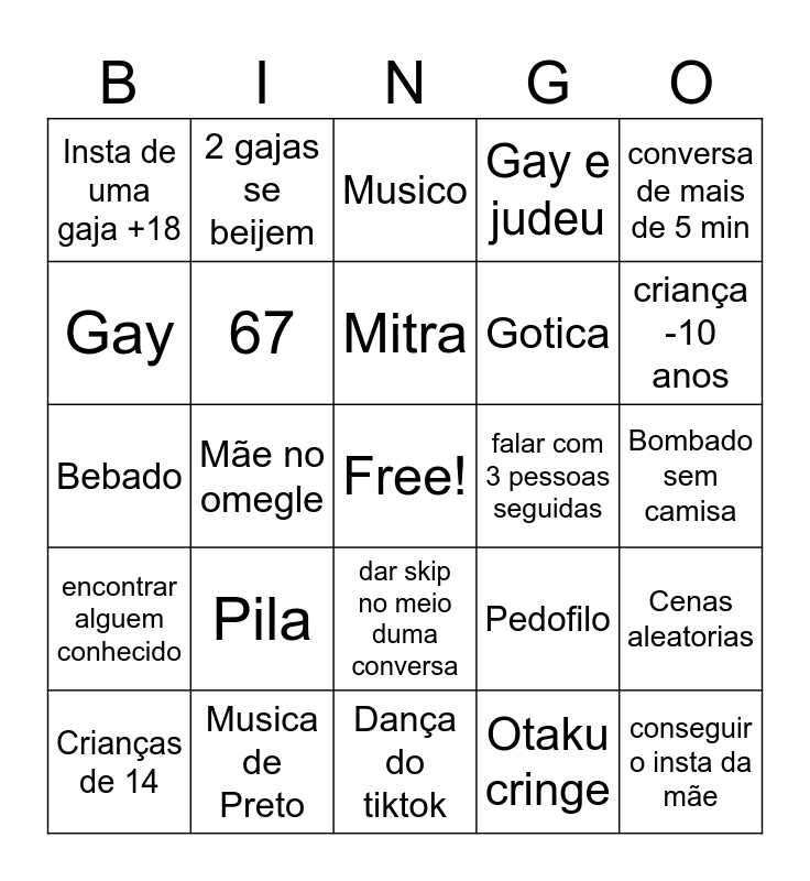 This bingo card has a free space and 24 words: Pila, Musica de Preto, Mitra, Crianças de 14, conversa de mais de 5 min, Insta de uma gaja +18, Gay, 2 gajas se beijem, falar com 3 pessoas seguidas, dar skip no meio duma conversa, Gotica, Bebado, Pedofilo, Cenas aleatorias, 67, Otaku cringe, Bombado sem camisa, Musico, criança -10 anos, Mãe no omegle, conseguir o insta da mãe, encontrar alguem conhecido, Gay e judeu and Dança do tiktok.