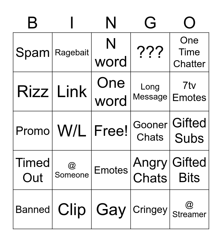 This bingo card has a free space and 24 words: Banned, @ Someone, One word, Cringey, One Time Chatter, Spam, Ragebait, N word, Gooner Chats, Gifted Subs, Promo, Link, Angry Chats, Gifted Bits, Rizz, Clip, Gay, ???, 7tv Emotes, Timed Out, W/L, Emotes, Long Message and @ Streamer.