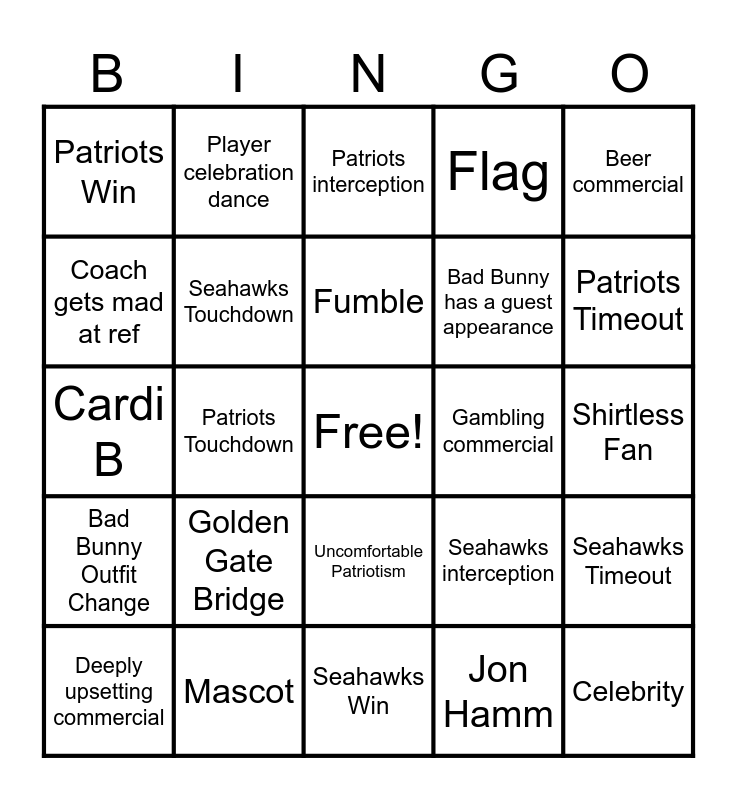 This bingo card has a free space and 24 words: Golden Gate Bridge, Mascot, Fumble, Deeply upsetting commercial, Beer commercial, Patriots Win, Coach gets mad at ref, Player celebration dance, Gambling commercial, Uncomfortable Patriotism, Bad Bunny has a guest appearance, Cardi B, Seahawks interception, Seahawks Timeout, Seahawks Touchdown, Jon Hamm, Shirtless Fan, Patriots interception, Patriots Timeout, Patriots Touchdown, Celebrity, Bad Bunny Outfit Change, Flag and Seahawks Win.