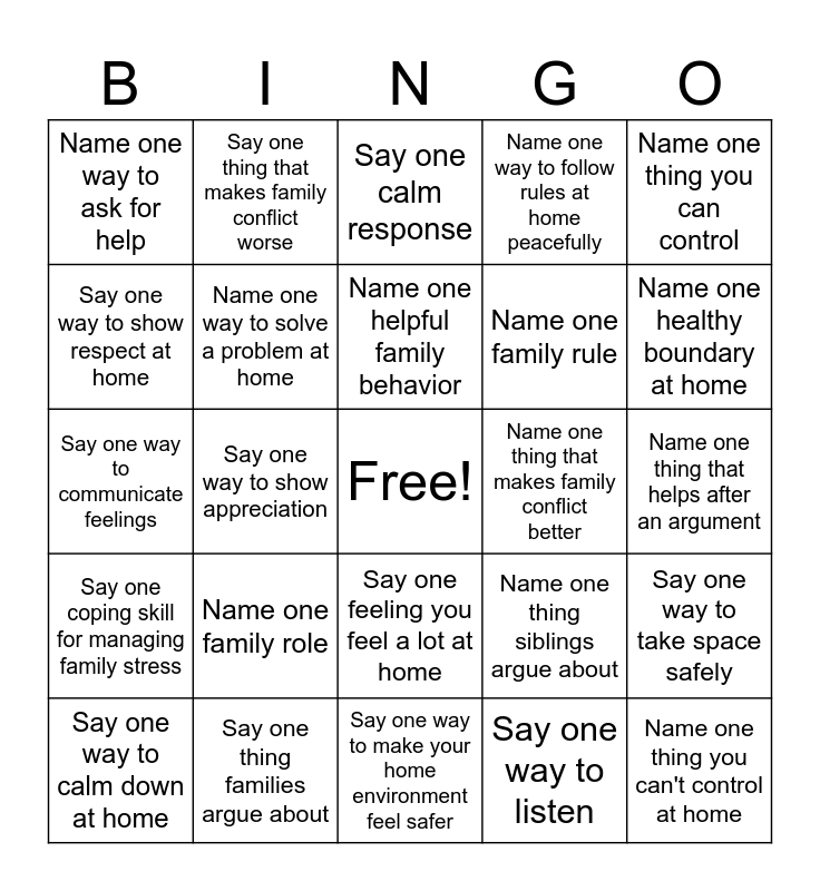 This bingo card has a free space and 24 words: Name one family role, Say one thing families argue about, Name one helpful family behavior, Say one way to calm down at home, Name one thing you can control, Name one way to ask for help, Say one way to show respect at home, Say one thing that makes family conflict worse, Name one thing that makes family conflict better, Say one feeling you feel a lot at home, Name one family rule, Say one way to communicate feelings, Name one thing siblings argue about, Say one way to take space safely, Name one way to solve a problem at home, Say one way to listen, Name one thing that helps after an argument, Say one calm response, Name one healthy boundary at home, Say one way to show appreciation, Name one thing you can't control at home, Say one coping skill for managing family stress, Name one way to follow rules at home peacefully and Say one way to make your home environment feel safer.
