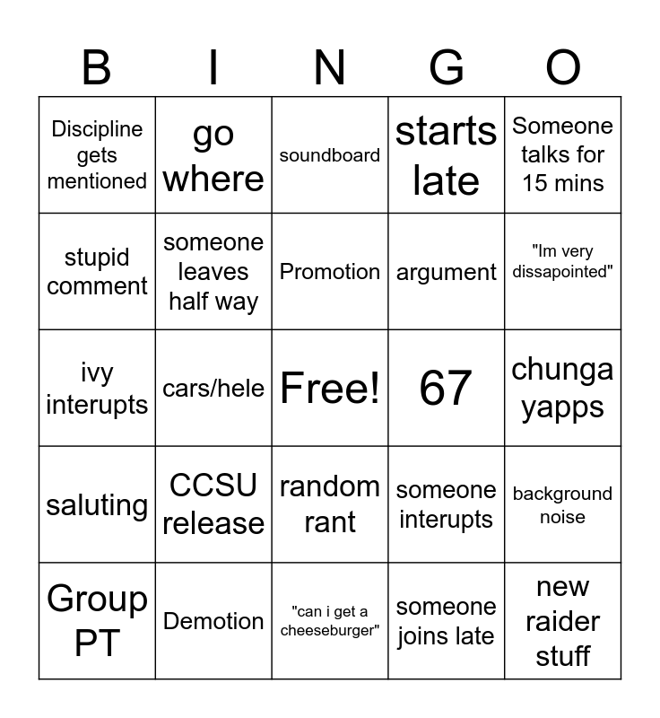 This bingo card has a free space and 24 words: CCSU release, Demotion, Promotion, Group PT, Someone talks for 15 mins, Discipline gets mentioned, stupid comment, go where, 67, random rant, argument, ivy interupts, someone interupts, background noise, someone leaves half way, someone joins late, chunga yapps, soundboard, "Im very dissapointed", cars/hele, new raider stuff, saluting, starts late and "can i get a cheeseburger".