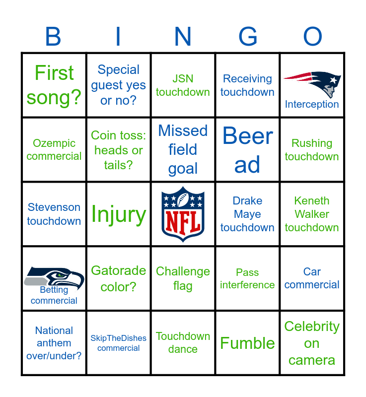 This bingo card has 2 images, a free space and 24 words: National anthem over/under?, Gatorade color?, Missed field goal, Fumble, Interception, First song?, Special guest yes or no?, JSN touchdown, Drake Maye touchdown, Keneth Walker touchdown, Stevenson touchdown, Coin toss: heads or tails?, Pass interference, Car commercial, Ozempic commercial, SkipTheDishes commercial, Touchdown dance, Receiving touchdown, Rushing touchdown, Betting commercial, Injury, Challenge flag, Beer ad and Celebrity on camera.