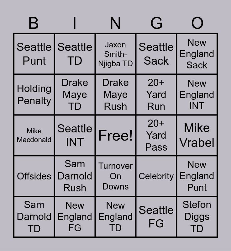 This bingo card has a free space and 24 words: Sam Darnold Rush, New England FG, Drake Maye Rush, Sam Darnold TD, New England Sack, Seattle Punt, Holding Penalty, Seattle TD, 20+ Yard Pass, Turnover On Downs, 20+ Yard Run, Mike Macdonald, Celebrity, New England Punt, Drake Maye TD, Seattle FG, Mike Vrabel, Jaxon Smith-Njigba TD, New England INT, Seattle INT, Stefon Diggs TD, Offsides, Seattle Sack and New England TD.