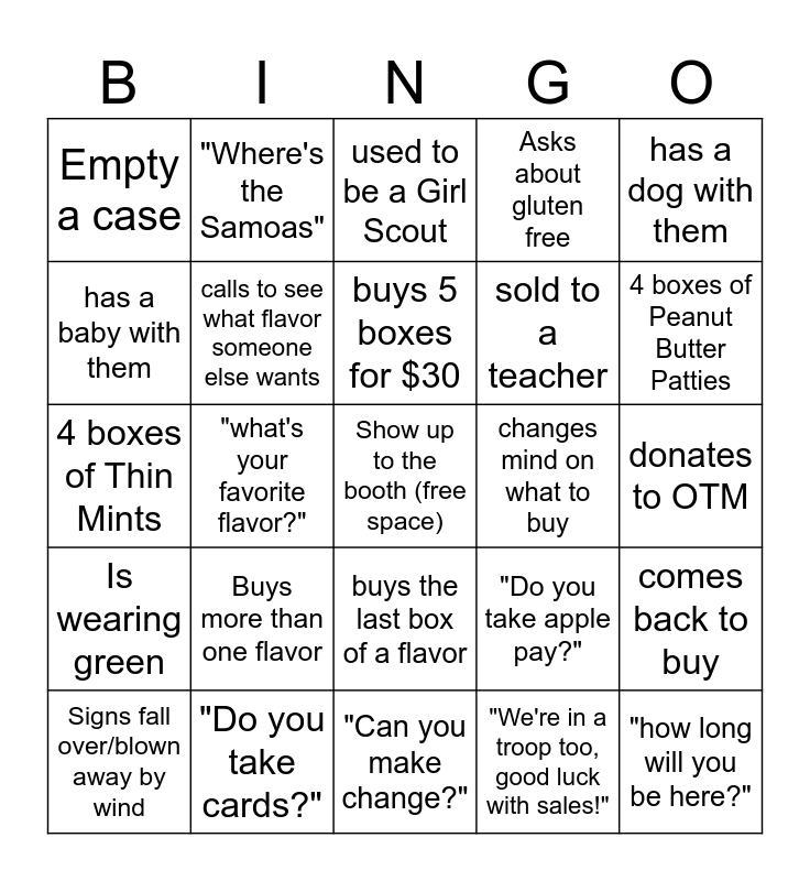 This bingo card has a free space and 24 words: Buys more than one flavor, "Do you take cards?", buys 5 boxes for $30, Signs fall over/blown away by wind, has a dog with them, Empty a case, has a baby with them, "Where's the Samoas", changes mind on what to buy, buys the last box of a flavor, sold to a teacher, 4 boxes of Thin Mints, "Do you take apple pay?", comes back to buy, calls to see what flavor someone else wants, "We're in a troop too, good luck with sales!", donates to OTM, used to be a Girl Scout, 4 boxes of Peanut Butter Patties, "what's your favorite flavor?", "how long will you be here?", Is wearing green, Asks about gluten free and "Can you make change?".