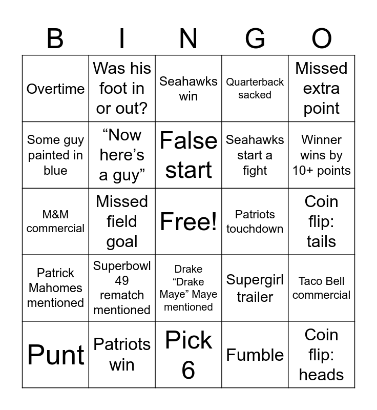 This bingo card has a free space and 29 words: Punt, Bad Bunny brings guest, Missed field goal, Seahawks score touchdown, Overtime, Seahawks win, “Now here’s a guy”, Superbowl 49 rematch mentioned, Patriots touchdown, Patriots win, Coin flip: tails, Coin flip: heads, Pick 6, Fumble, Winner wins by 10+ points, Cameras show Cardi B, Drake “Drake Maye” Maye mentioned, Patrick Mahomes mentioned, Missed extra point, M&M commercial, Supergirl trailer, Patriots start a fight, Seahawks start a fight, Some guy painted in blue, Quarterback sacked, Was his foot in or out?, Taco Bell commercial, False start and Refs reverse call.