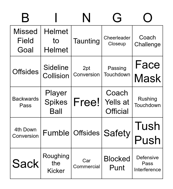 This bingo card has a free space and 39 words: Defensive Touchdown, Interception, Offensive Pass Interference, Sideline Collision, Sack, Offsides, 2pt Conversion, Fumble Recovery, Coach Challenge, 4th Down Conversion, Player Spikes Ball, Cheerleader Closeup, Defensive Pass Interference, Rushing Touchdown, Coach Yells at Official, Fumble, Personal Foul, Missed Field Goal, False Start, Safety, Offsides, Car Commercial, Passing Touchdown, Face Mask, Flea Flicker, Fair Catch, Late Hit, Holding, Horse Collar, Helmet to Helmet, Too Many Men on the Field, Delay of Game, Taunting, Roughing the Kicker, Blocked Punt, Roughing the Passer, Tush Push, Backwards Pass and Intentional Grounding.