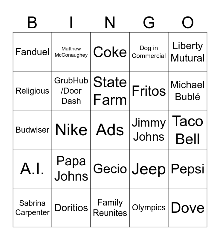 This bingo card has a free space and 41 words: T-Moblie, Budwiser, Oreo, GrubHub /Door Dash, Doritios, Gecio, State Farm, Verison, Liberty Mutural, A.I., Nike, Dog in Commercial, Dove, Taco Bell, Jimmy Johns, Papa Johns, Booking.com, Fanduel, Dr.Pepper, Coke, Pepsi, Car Drives Through Mud, Family Reunites, Fritos, Rocket Mortgage, Turbo Tax, Olympics, M&M's, Michael Bublé, Corna, Cheerios, Matthew McConaughey, Sabrina Carpenter, Kevin Hart, Jeep, Religious, Buffalo Wild Wings, Dodge, Ram, Disney and Devil Wears Prada 2.