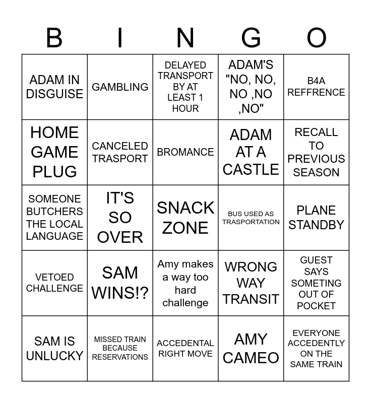 This bingo card has a free space and 29 words: SAM IS UNLUCKY, WE'RE SO BACK, IT'S SO OVER, DRUNK BEN, ADAM IN DISGUISE, DELAYED TRANSPORT BY AT LEAST 1 HOUR, CANCELED TRASPORT, SAM WINS!?, BUS USED AS TRASPORTATION, MISSED TRAIN BECAUSE RESERVATIONS, PLANE STANDBY, EVERYONE ACCEDENTLY ON THE SAME TRAIN, ACCEDENTAL RIGHT MOVE, AMY CAMEO, RECALL TO PREVIOUS SEASON, THE BOYS GET RECONIZED, Amy makes a way too hard challenge, VETOED CHALLENGE, B4A REFFRENCE, SOMEONE BUTCHERS THE LOCAL LANGUAGE, WRONG WAY TRANSIT, MIC PROBLEMS, ADAM AT A CASTLE, HOME GAME PLUG, ADAM'S "NO, NO, NO ,NO ,NO", GAMBLING, GUEST SAYS SOMETING OUT OF POCKET, BROMANCE and REFRENCE TO ANOTHER SHOW ON NEBULA.