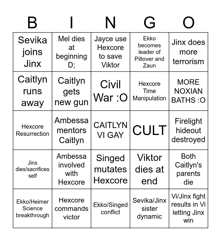 This bingo card has a free space and 24 words: Ambessa involved with Hexcore, Hexcore commands victor, Civil War :O, Ekko/Heimer Science breakthrough, Jinx does more terrorism, Sevika joins Jinx, Caitlyn runs away, Mel dies at beginning D;, CULT, Singed mutates Hexcore, Hexcore Time Manipulation, Hexcore Resurrection, Viktor dies at end, Both Caitlyn's parents die, Caitlyn gets new gun, Sevika/Jinx sister dynamic, Firelight hideout destroyed, Jayce use Hexcore to save Viktor, MORE NOXIAN BATHS :O, Ambessa mentors Caitlyn, Vi/Jinx fight results in Vi letting Jinx win, Jinx dies/sacrifices self, Ekko becomes leader of Piltover and Zaun and Ekko/Singed conflict.