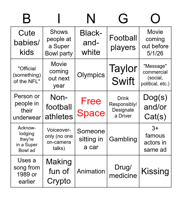 This bingo card has a free space and 29 words: Uses a song from 1989 or earlier, The Elderly, Non- football athletes, Multiple parts (with storyline), Cute babies/ kids, Black-and-white, Movie coming out next year, Voiceover- only (no one on-camera talks), Drink Responsibly/ Designate a Driver, Making fun of Crypto, Dog(s) and/or Cat(s), Kissing, Animation, Drug/ medicine, "Message" commercial (social, political, etc.), Football players "acting", Someone sitting in a car, Acknow- lodging they're in a Super Bowl ad, Movie coming out before 5/1/26, Person or people in their underwear, Gambling, Animal(s) besides dogs & cats, Taylor Swift, "Official (something) of the NFL", Football players, Shows people at a Super Bowl party, 3+ famous actors in same ad, Olympics and Product has nothing to do with commercial.