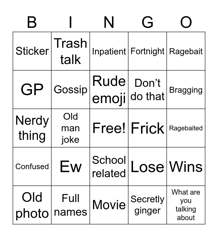 This bingo card has a free space and 24 words: Ew, Full names, Rude emoji, Old photo, Ragebait, Sticker, GP, Trash talk, Frick, School related, Don’t do that, Nerdy thing, Lose, Wins, Gossip, Secretly ginger, Ragebaited, Inpatient, Bragging, Old man joke, What are you talking about, Confused, Fortnight and Movie.