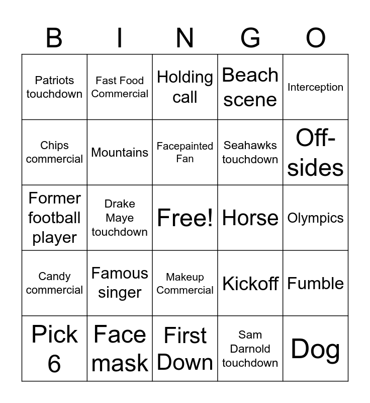 This bingo card has a free space and 50 words: Sack, Dog, Tom Brady, First Down, Famous singer, Famous actor, Fast Food Commercial, Beer commercial, Chips commercial, Car commercial, Mountains, Beach scene, Fumble, Kickoff, Punt, Field goal, Facepainted Fan, Horse, American Flag, Interception, Drake Maye touchdown, Sam Darnold touchdown, Patriots touchdown, Seahawks touchdown, Uber Eats commercial, Bad Bunny, Off-sides, Pass interference, Holding call, Makeup Commercial, Clothing commercial, Coin flip, Third down conversion, Booth review, Face mask, Tushpush!!, Sports betting commercial, Pizza, Movie Commercial, Olympics, Cheerleaders, Extra point, Safety, Two point conversion, Pick 6, Former football player, Fan without their shirt on, Vince Lambardi Trophy, Candy commercial and GLP-1 Commercial.
