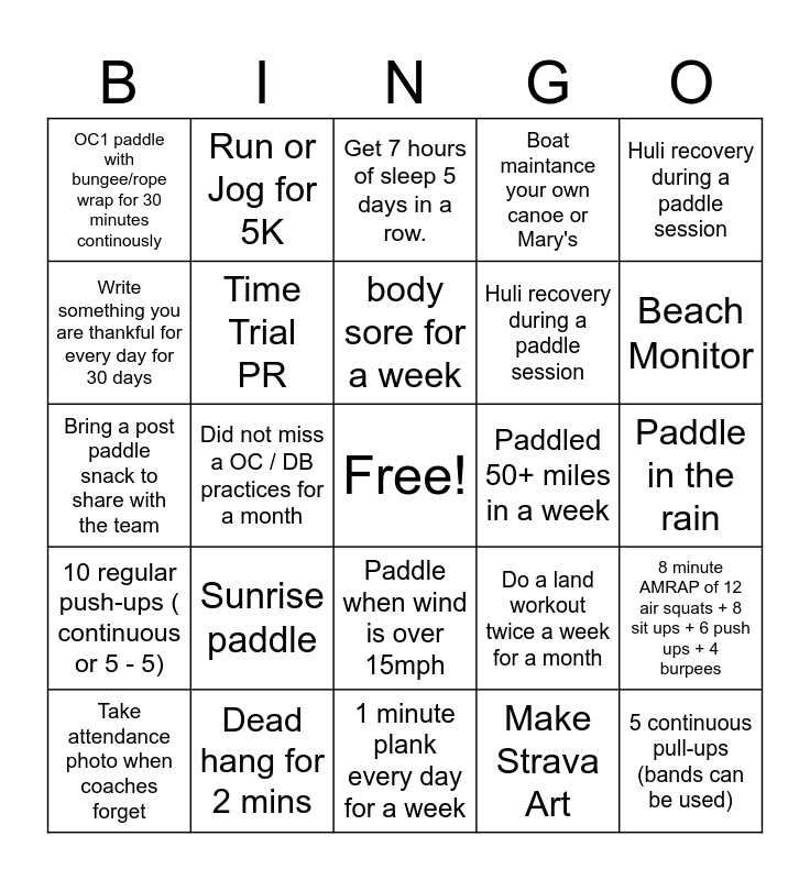 This bingo card has a free space and 24 words: Sunrise paddle, Dead hang for 2 mins, body sore for a week, Take attendance photo when coaches forget, Huli recovery during a paddle session, OC1 paddle with bungee/rope wrap for 30 minutes continously, Write something you are thankful for every day for 30 days, Run or Jog for 5K, Paddled 50+ miles in a week, Paddle when wind is over 15mph, Huli recovery during a paddle session, Bring a post paddle snack to share with the team, Do a land workout twice a week for a month, 8 minute AMRAP of 12 air squats + 8 sit ups + 6 push ups + 4 burpees, Time Trial PR, Make Strava Art, Paddle in the rain, Get 7 hours of sleep 5 days in a row., Beach Monitor, Did not miss a OC / DB practices for a month, 5 continuous pull-ups (bands can be used), 10 regular push-ups ( continuous or 5 - 5), Boat maintance your own canoe or Mary's and 1 minute plank every day for a week.
