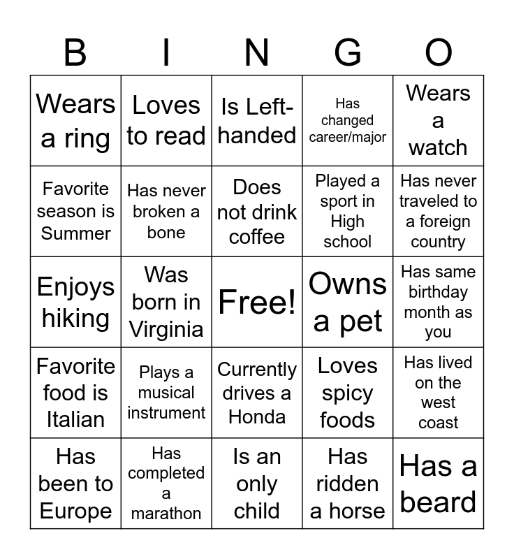 This bingo card has a free space and 29 words: Has been to Europe, Has eaten Sushi, Was born in Virginia, Has 3 or more siblings, Wears a ring, Is Left-handed, Has never broken a bone, Plays a musical instrument, Owns a pet, Has completed a marathon, Has same birthday month as you, Has a beard, Is an only child, Has ridden a horse, Has never traveled to a foreign country, Loves the color green, Currently drives a Honda, Favorite food is Italian, Wears a watch, Enjoys hiking, Loves spicy foods, Has fallen asleep in a movie theater, Played a sport in High school, Favorite season is Summer, Has changed career/major, Loves to read, Has lived on the west coast, Does not drink coffee and Can do a cart wheel.