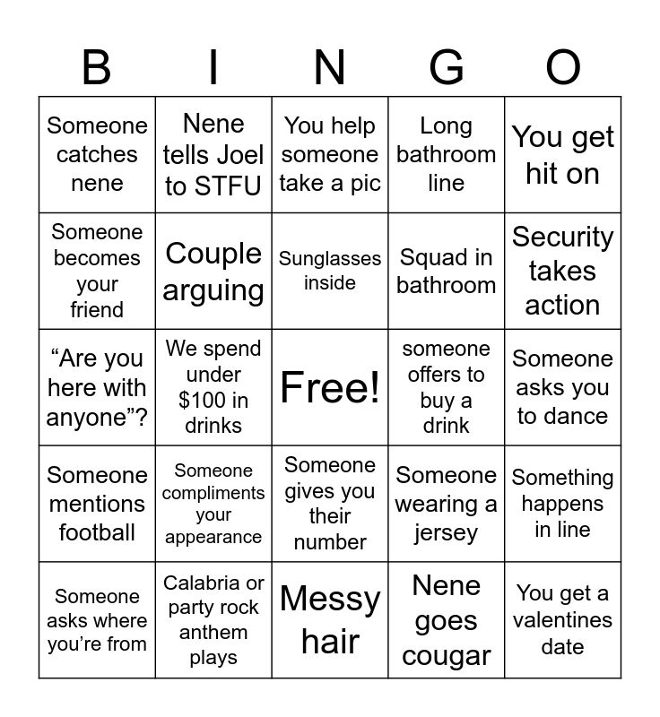 This bingo card has a free space and 24 words: Someone compliments your appearance, Calabria or party rock anthem plays, Sunglasses inside, Someone asks where you’re from, You get hit on, Someone catches nene, Someone becomes your friend, Nene tells Joel to STFU, someone offers to buy a drink, Someone gives you their number, Squad in bathroom, “Are you here with anyone”?, Someone wearing a jersey, Something happens in line, Couple arguing, Nene goes cougar, Someone asks you to dance, You help someone take a pic, Security takes action, We spend under $100 in drinks, You get a valentines date, Someone mentions football, Long bathroom line and Messy hair.