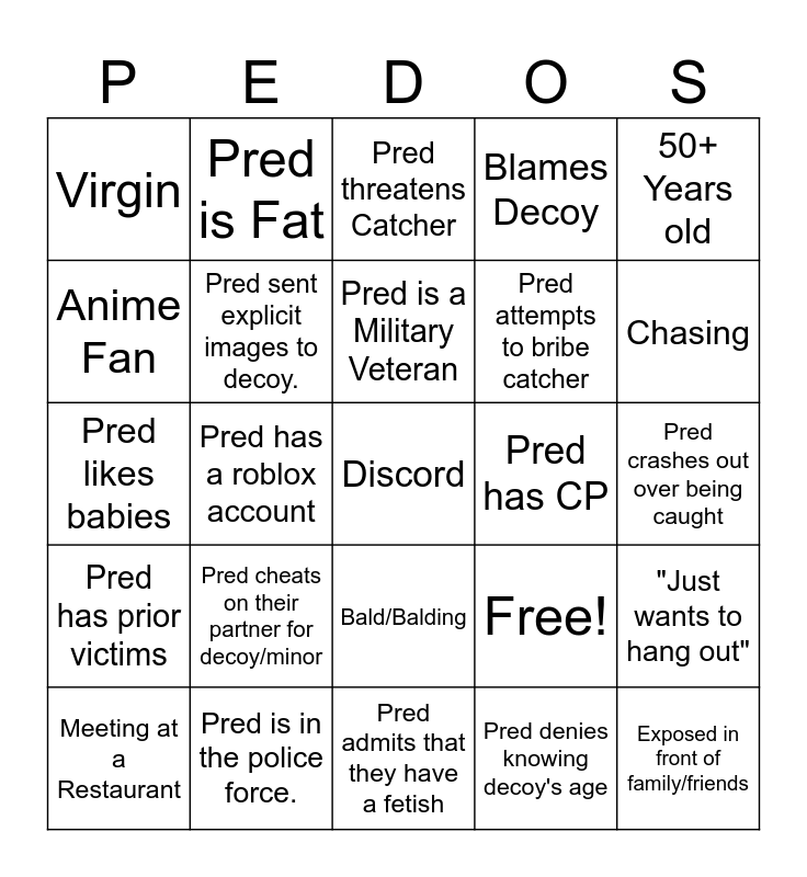 This bingo card has 25 words: Pred cheats on their partner for decoy/minor, Pred admits that they have a fetish, Pred is a Military Veteran, Meeting at a Restaurant, 50+ Years old, Virgin, Anime Fan, Pred is Fat, Pred has CP, Bald/Balding, Pred attempts to bribe catcher, Pred likes babies, Free!, "Just wants to hang out", Pred sent explicit images to decoy., Exposed in front of family/friends, Pred crashes out over being caught, Pred threatens Catcher, Chasing, Pred has a roblox account, Discord, Pred is in the police force., Pred has prior victims, Blames Decoy and Pred denies knowing decoy's age.