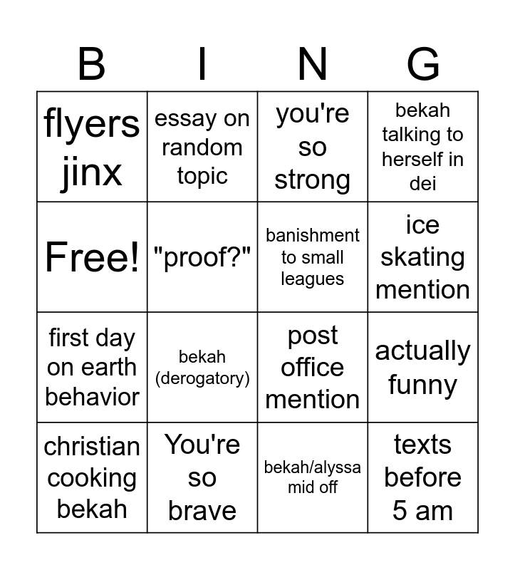 This bingo card has 16 words: You're so brave, actually funny, you're so strong, flyers jinx, first day on earth behavior, essay on random topic, post office mention, bekah/alyssa mid off, Free!, "proof?", christian cooking bekah, bekah talking to herself in dei, bekah (derogatory), ice skating mention, banishment to small leagues and texts before 5 am.