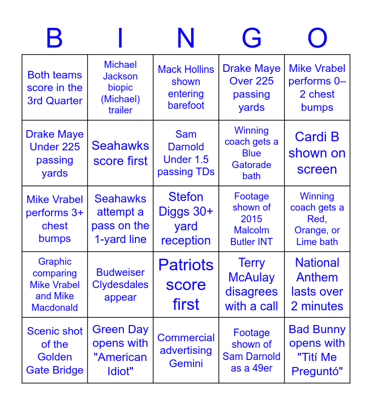 This bingo card has 35 words: Free!, Coin Toss is Heads, Coin Toss is Tails, Seahawks score first, Patriots score first, Drake Maye Over 225 passing yards, Drake Maye Under 225 passing yards, Sam Darnold Over 1.5 passing TDs, Sam Darnold Under 1.5 passing TDs, Successful 2-point conversion, Mike Vrabel performs 3+ chest bumps, Mike Vrabel performs 0–2 chest bumps, Both teams score in the 1st Quarter, Both teams score in the 2nd Quarter, Both teams score in the 3rd Quarter, Footage shown of 2015 Malcolm Butler INT, Footage shown of Sam Darnold as a 49er, Seahawks attempt a pass on the 1-yard line, Graphic comparing Mike Vrabel and Mike Macdonald, Stefon Diggs 30+ yard reception, Terry McAulay disagrees with a call, Scenic shot of the Golden Gate Bridge, National Anthem lasts over 2 minutes, Green Day opens with "American Idiot", Mack Hollins shown entering barefoot, Cardi B shown on screen, Bad Bunny opens with "Tití Me Preguntó", Bad Bunny has 2+ wardrobe changes, Winning coach gets a Blue Gatorade bath, Winning coach gets a Red, Orange, or Lime bath, Commercial advertising ChatGPT, Commercial advertising Gemini, Budweiser Clydesdales appear, Michael Jackson biopic (Michael) trailer and The Mandalorian & Grogu trailer.