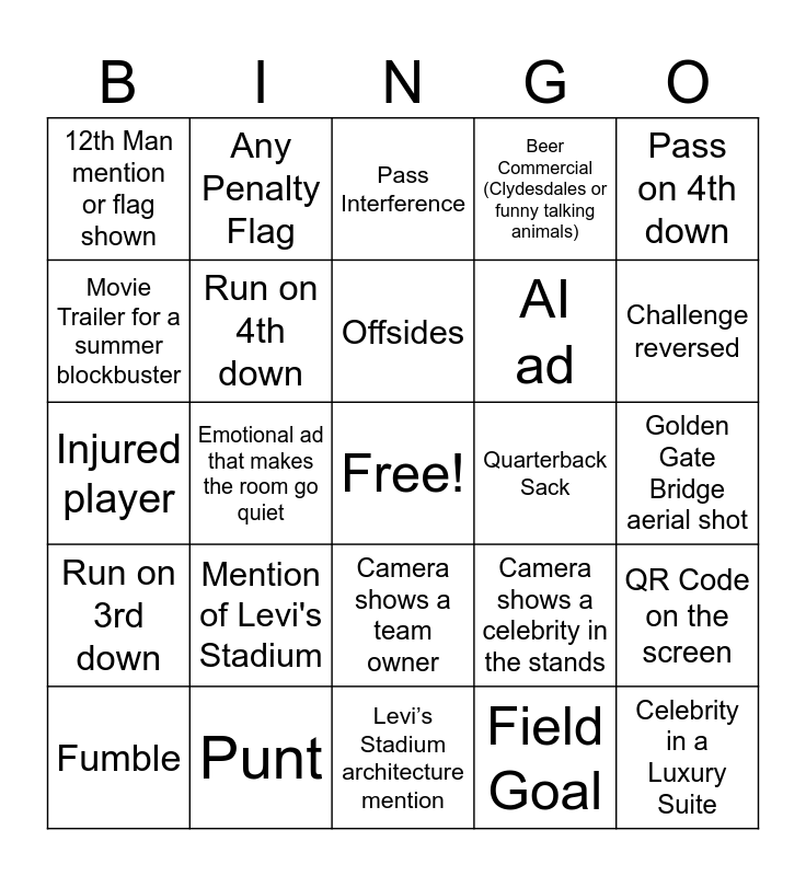 This bingo card has a free space and 34 words: Touchdown, Field Goal, Interception, Pass on 1st down, Run on 3rd down, Run on 4th down, Pass on 4th down, Fumble, Any Penalty Flag, False Start, Offsides, Pass Interference, Challenge Flag thrown, Timeout, Quarterback Sack, Challenge reversed, Punt, Injured player, Mention of Levi's Stadium, Camera shows a celebrity in the stands, Camera shows a team owner, Mention of a player's college, 12th Man mention or flag shown, Golden Gate Bridge aerial shot, Levi’s Stadium architecture mention, Celebrity in a Luxury Suite, Beer Commercial (Clydesdales or funny talking animals), Electric Vehicle (EV) ad, AI ad, Movie Trailer for a summer blockbuster, Soda War (Pepsi vs. Coke), Emotional ad that makes the room go quiet, QR Code on the screen and Snack Ad (Doritos, Pringles, etc.).
